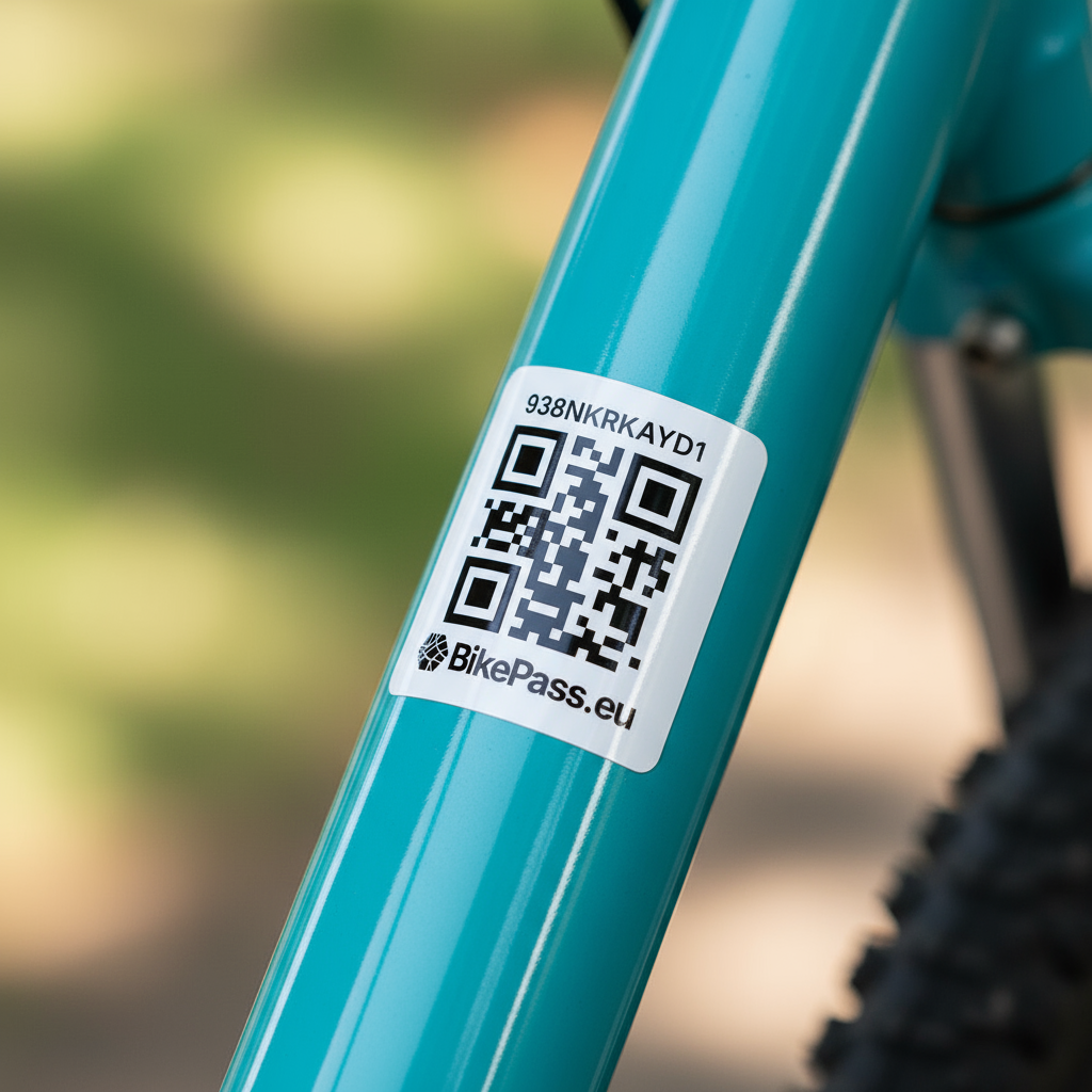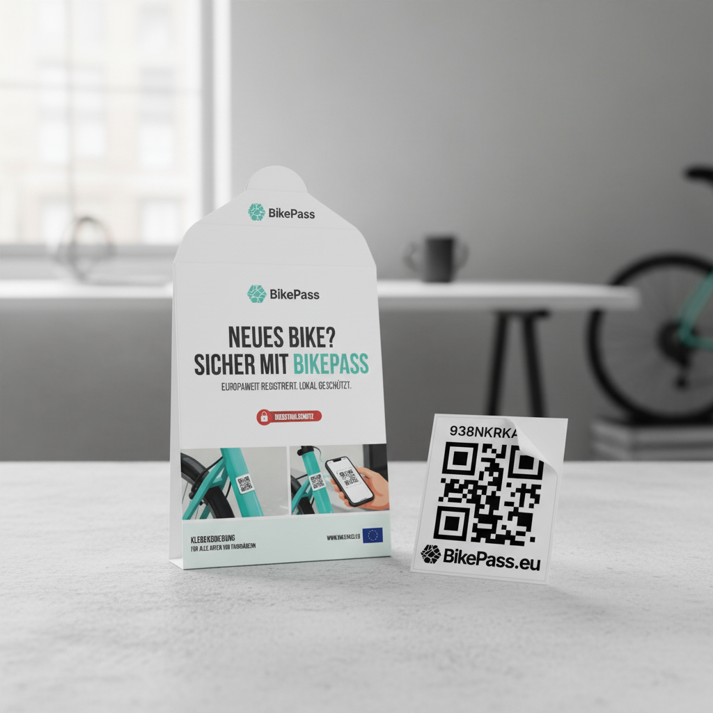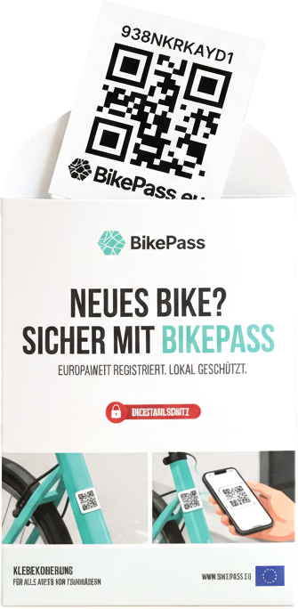 Die Fahrradkodierung BikePass macht dein Fahrrad eindeutig identifizierbar – digital und physisch. Der digitale Fahrradpass schafft ein sicheres Register für Eigentum und Dokumentation. Die BikePass ID bringt diese Identität direkt aufs Fahrrad: fälschungssichere Kodierung, europaweit erkennbar, sofort überprüfbar: für Community, Polizei & Behörden.