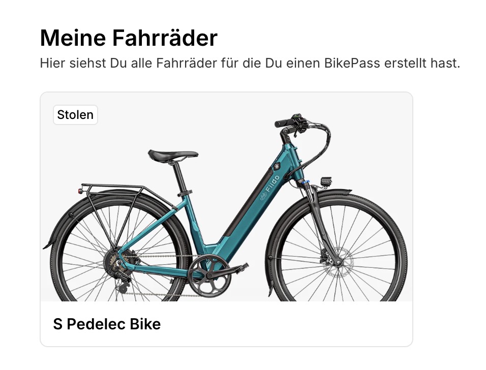 BikePass skaliert dabei mit Deinem Fuhrpark. In einem Account verwaltest Du beliebig viele Fahrräder, vom Citybike bis zum S-Pedelec. Jede Fahrradkodierung bleibt einem eigenen Datensatz zugeordnet, mit eigener Historie und eigenem Status. So behältst Du auch bei mehreren Rädern die Übersicht, welche Bikes aktiv im Einsatz, verkauft oder als gestohlen gemeldet sind.