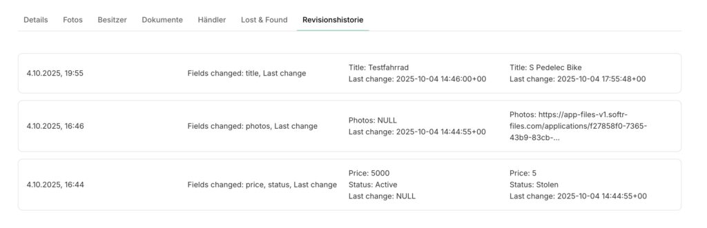 Alle Änderungen an deinem BikePass werden protokolliert. So bleibt jederzeit nachvollziehbar, wann und wie sich der Status deines Fahrrads verändert hat.